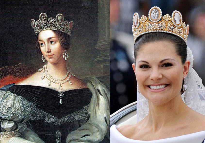 Жозефин Лойхтенбергска (1807-1876), кралица на Швеция и Норвегия, и нейната предшественичка принцеса Виктория Шведска със същата тиара на Chaumet.