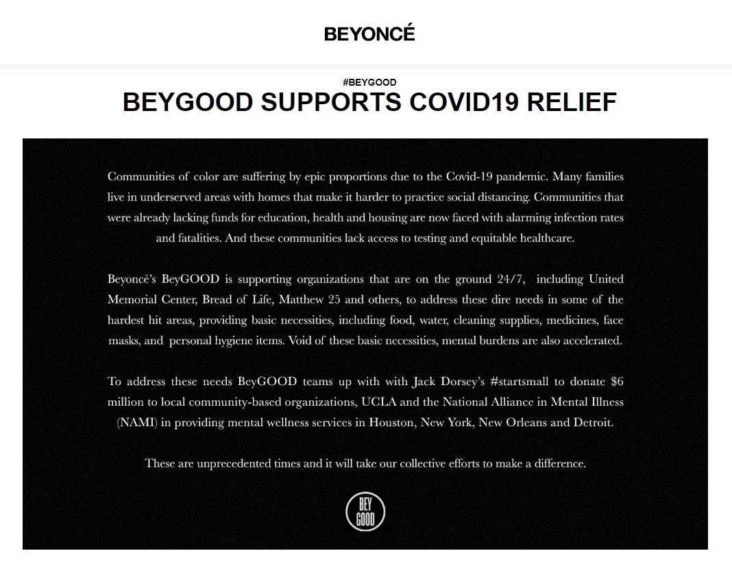 Певицата, с подкрепата на майка си, Тина Ноулс, ще финансира производството и доставката на надеждни тестове за откриване на коварния вирус. По този начин по-лесно ще се разбере реалният брой на заразените и носителите, което на свой ред ще доведе до вземането на по-адекватни мерки за спирането на разпространяването на заразата. Впрочем съпругата на Джей Зи вече отпусна 6 млн. долара на асоциации, които помагат на най-бедните в тези тежки времена. Освен това майка и дъщеря много пъти са участвали в други хуманитарни акции.