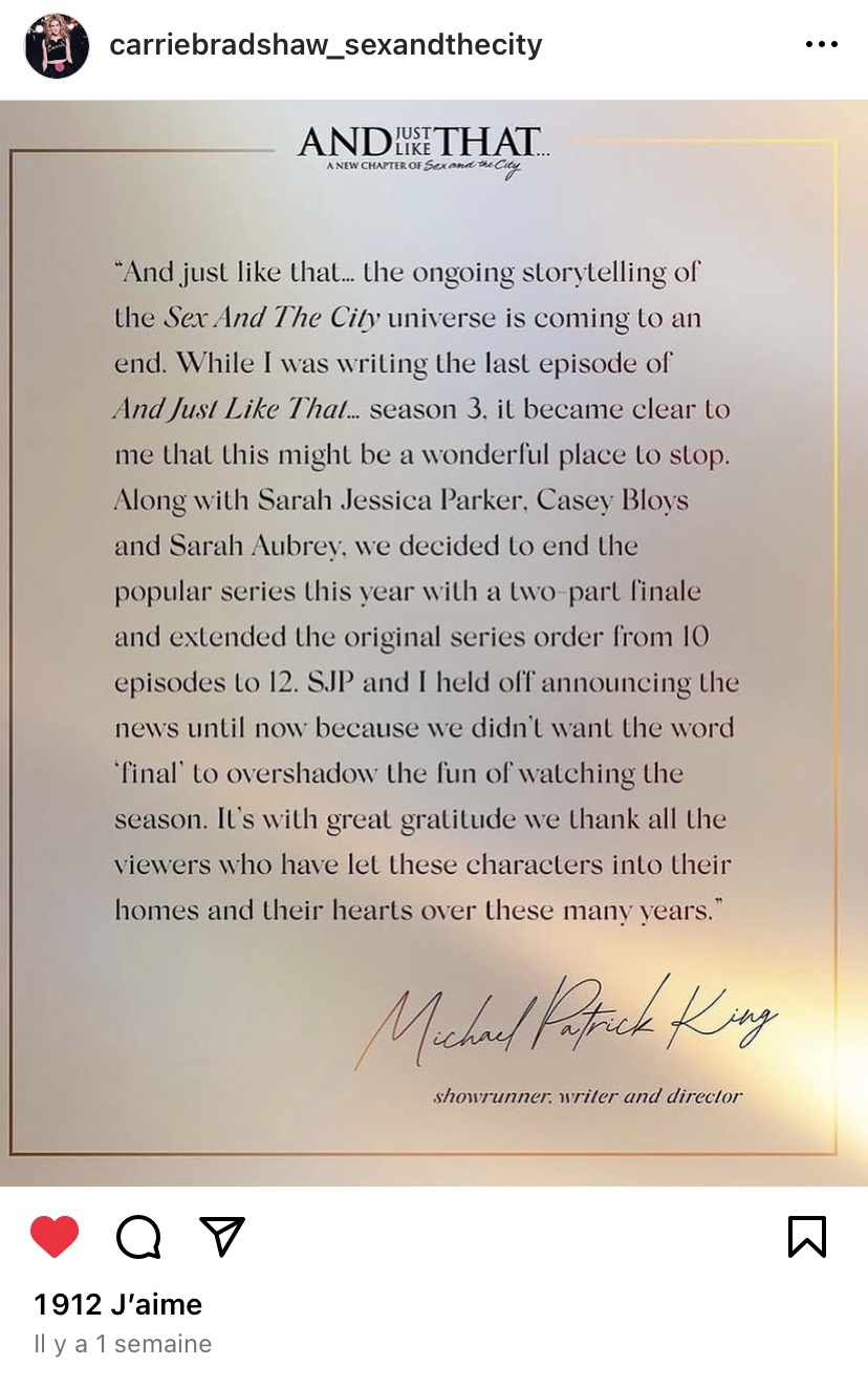 Новината бе оповестена и в Instagram от Майкъл Патрик Кинг, шоурънър, сценарист и режисьор на телевизионните серии: „И просто ей така… продължението на вселената на „Сексът и градът” достигна своя край. Докато писах последния епизод от третия сезон на „И просто ей така”, установих, че това ще бъде идеалният момент да го спрем. Заедно със Сара Джесика Паркър, Кейси Блойс и Сара Обри, решихме да приключим популярните серии с финал от две части, увеличавайки последния сезон с цели два епизода. Досега Сара Джесика Паркър и аз изчаквахме да дойде идеалния момент, за да оповестим новината, понеже не искахме думата „финал” да почерни забавлението от гледането на сезона. С огромна признателност искаме да благодарим на нашите зрители, които поканиха тези персонажи да влязат в домовете и сърцата им през всички тези години.”.
