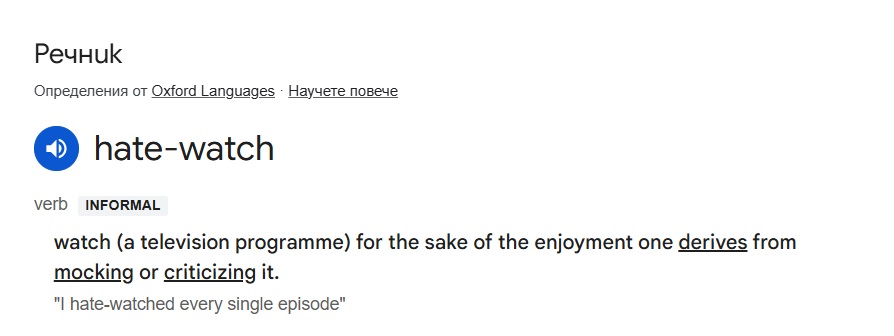 Зрителите не само гледат с интерес новите серии, но и неспирно се оплакват от тях и критикуват почти всичко и всекиго. Така се зароди и новата английска фраза „to hate-watch”, която на български се превежда като „гледам с омраза”. С други думи, човек да гледа нещо, което му е много досадно, отвратително и чак противно, но да не може да спре да го гледа, защото се интересува какви ще бъдат развръзката и краят на визуалния разказ.
