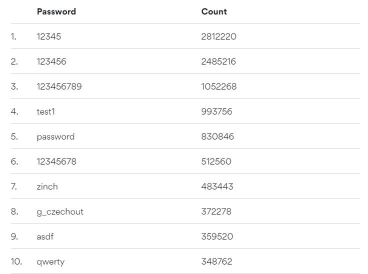 Най-популярната парола се оказа комбинацията от числа от 1 до 9. Само в топ 10 тя получи четири места (2.8 милиона души предпочитат пет числа, а 1 млн. души искат по-надеждна парола и изписват всичките девет), а в топ 200 нейните различни варианти са повече от дузина. В топ 5 на най-популярните пароли са включени също test1 (993 000 души) и думата „парола“ (password, 831 000 души). Близо 350 000 души използват паролата qwerty, за да защитят своите акаунти, а 170 000 души използват iloveyou („Обичам те“). Често се срещат прякори („принцеса“, „бебе“, „слънце“) и имена („Ашли“, „Чарли“, „Майкъл“, „Никол“). Много хора смятат за надежден набора от букви на клавиатурата вертикално, хоризонтално или диагонално (1qaz2wsx и asdfghjkl) или имената на марки (Hello Kitty, Samsung, OneDirection) и спортове („футбол“, „хокей“, „баскетбол“).