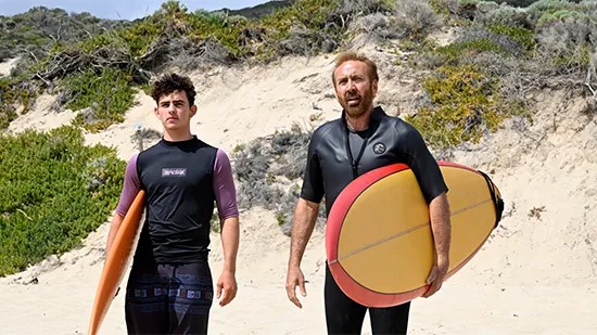 От сериозното до смешното има една крачка, и филмът я прави още в първата сцена. Безименният герой (а защо му е име – Кейдж си е Кейдж) докарва сина си – ученик в горните класове – на плажа с надеждата да посърфира по тукашните вълни. Първият монолог е банална метафора на сърфинга като жизнена траектория, а същевременно и инициация на младия мъж.