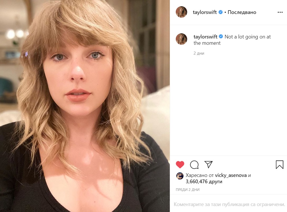 Преди броени дни ви разказвахме какво прави по време на пандемията брилянтната Джейн Фонда, сега дойде ред да узнаете за ежедневието на кралицата на кънтри музиката Тейлър Суифт.