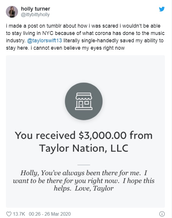 Тейлър Суифт е от хората, които помагат с каквото могат в борбата с коронавируса. Неотдавна плати трудовите възнаграждения и здравните осигуровки за следващите три месеца на всички служители от музикалния магазин „Grimey’s“ в град Нашвил, Тенеси, откъдето започна музикалната ѝ кариера. Също така ѝ стана навик да превежда по 3000 долара на свои фенове, след като прочита в социалните мрежи за финансовите им затруднения по време на извънредното положение. Сред щастливците е Саманта Джейкъбсън, която след като бе съкратена от Walt Disney World Resort в Орландо, Флорида, получи лично съобщение за финансовата подкрепа от певицата.