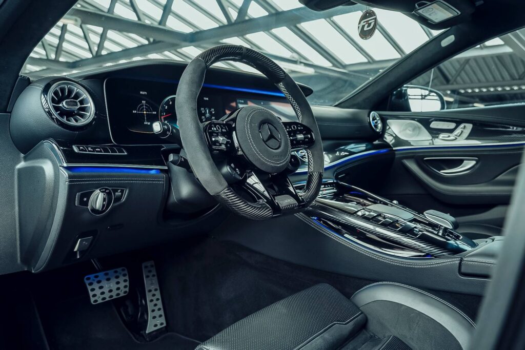 Освен това, въглеродните влакна са използвани щедро на централната конзола, което се допълва добре от синьото околно осветление, от волана от алкантара и от почти повсеместното използване на кожа. Fostla наистина превзе грандиозния интериор на Mercedes AMG GT 63 и го издигна на ново ниво. Цената също е „красива“ – 453 000 евро, но ви гарантира лукс и уникалност от най-рядък вид.