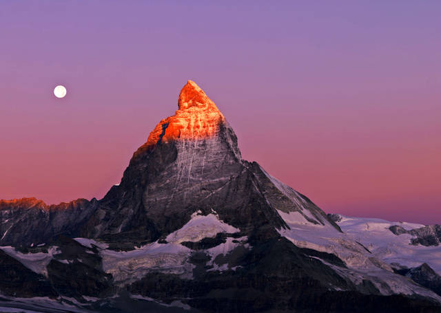Матерхорн се намира на границата между Швейцария и Италия и е един от най-високите върхове в Алпите. Гледката към него при залез слънце направо спира дъха.