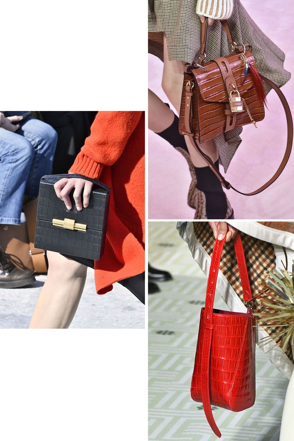 Става дума за чанти, чиято външна страна е изработена от релефна материя, имитираща кожата на питон, крокодил, игуана, или черни чанти от тип кутия, за които англофоните използват термина the croc effect. Цените варират, но в повечето случаи са достъпни, а трендът позволява използването както на истинска, така и на изкуствена кожа.