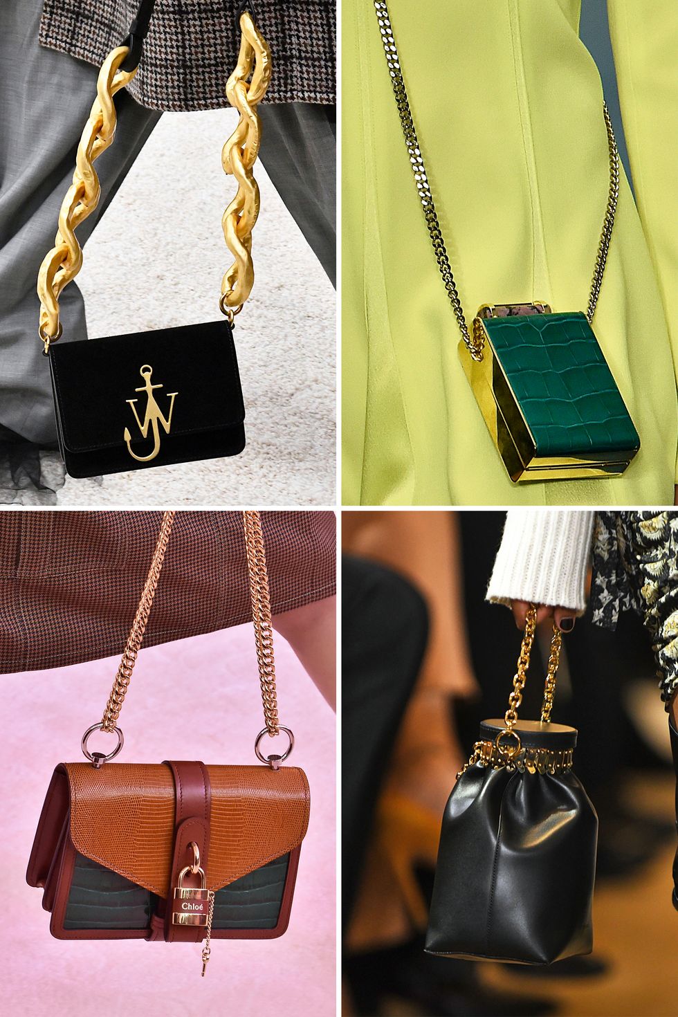 Синджирите отново се завърнаха като важна част от чантите. Въпреки че британската модна марка JW Anderson заложи на големите вериги, редица други брандове като Carolina Herrera, Altuzarra и Chloé предпочетоха да се придържат към класическия вариант. Какъвто и вариант да изберете, със сигурност ще бъдете в крак с модата!