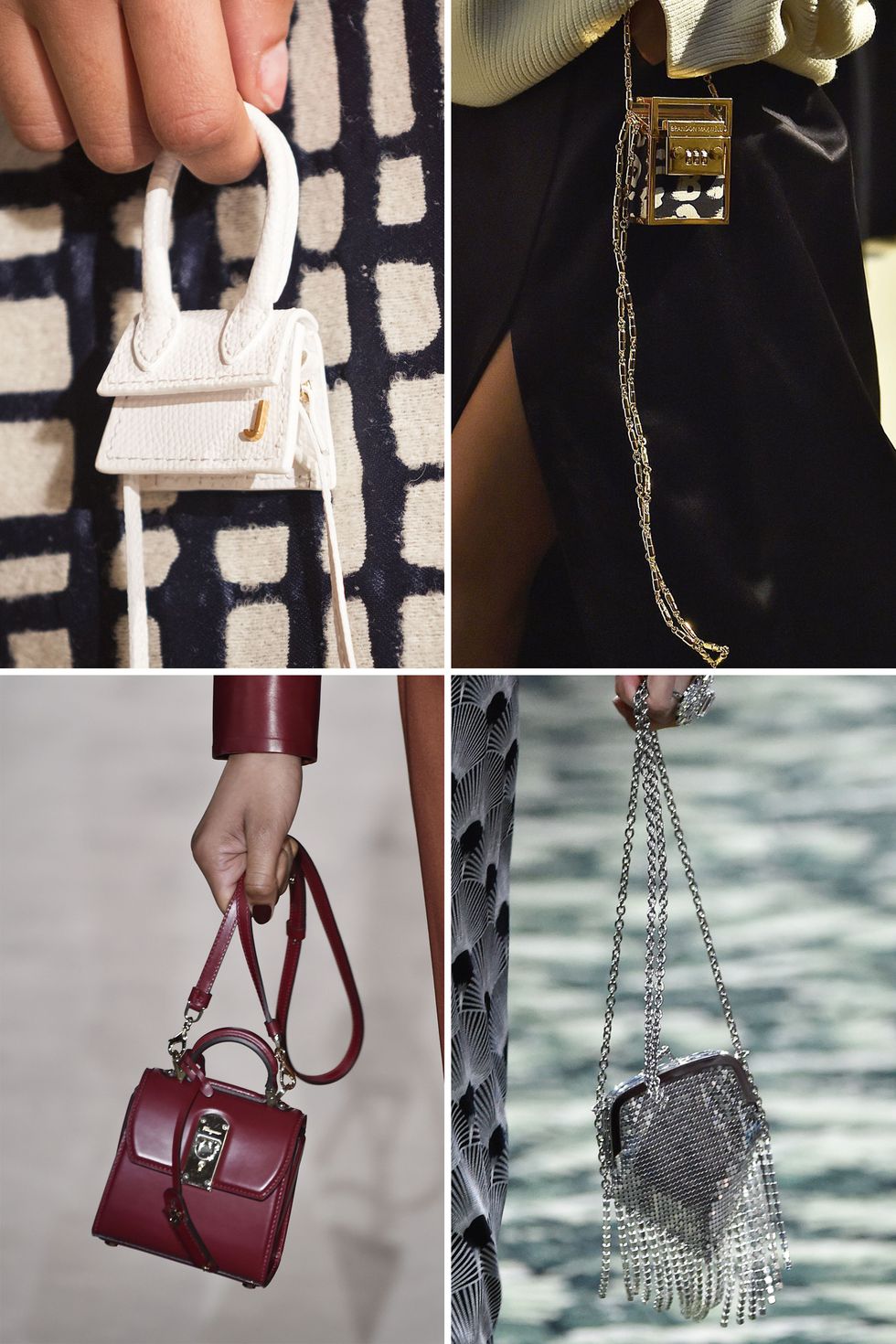 Противоположно на тренда за големи чанти, някои модни брандове предпочитат да ги смаляват. Истински рекорд беше поставен от френската модна къща Jacquemus, която представи аксесоари с кукленски размери, които не биха могли да поберат нищо друго освен пръстен или слушалки с тапи като AirPods. За щастие и сред малките чанти има по-обемисти.