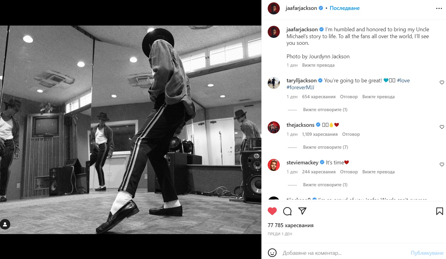 „За мен е чест да вдъхна живот на историята на чичо ми Майкъл. Към всички фенове по света, ще се видим много скоро.“ – сподели младата звезда в личния си Instagram профил, бидейки и първата му публикация в социалната мрежа.