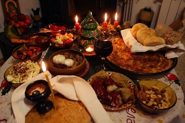 На трапезата има сарми, баница с късмети, питка, вино, ракия. Трапезата се прекадява и благославя, всички си вземат прошка с целуване на ръка.