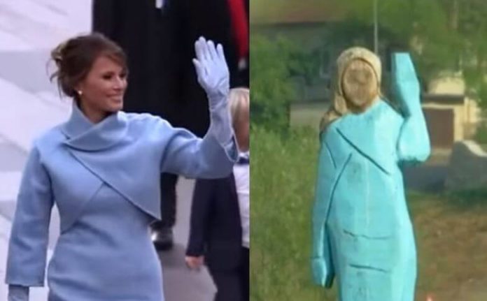 Над създаването на дървената фигура с реални размери се е трудил местният занаятчия Алес Цупевич. Мелания Тръмп е облечена в син костюм и маха точно както на инагурацията на Доналд Тръмп. Затова мнозина в мрежата се шегуват, че първата лейди и статуята й си приличат като две капки вода.