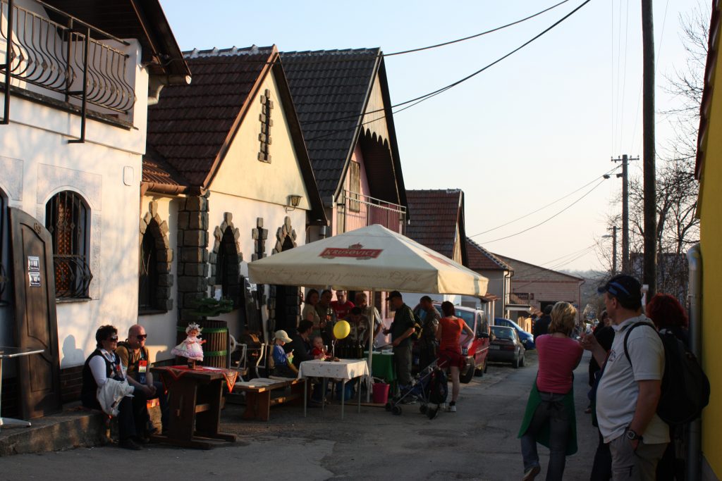 Но след пет срещи с Дионис в три изби, мъжката част вече имаше усещането че левитира, затова седнахме да обсъдим дългосрочна стратегия. Тя включваше какво точно искаме да видим и как в най-пълна степен да се възползваме от богатствата на региона и сърдечността на домакините. Извън алкохолно-промоционния характер на подобно събитие, повечето винопроизводители се отнасяха благосклонно към тези, които искаха да потопят нос в автентичните им бели и червени вина, и затова предлагаха богати закуски от наденички, яйца, кисели краставички, препечени свински кожички и така нататък. За голяма наша изненада те се справяха със задачата далеч по-добре, отколкото френските сирена и багети… Но изкушенията бяха много, защото европейските и регионални фондове бяха отпуснали преди време достатъчно пари, които местните управи са използвали за създаването на добре маркиран винен маршрут, покриващ повечето от най-добрите изби в Моравия, така че обикалянето на всички бе малко трудна задача. За щастие някои от тях не бяха съвсем близо една до друга, така че човек имаше време да изтрезнее, преди отново да се залови сериозно за работа. А на картата бяха указани и обиколни маршрути, вероятно точно с тази цел… което не беше съвсем сигурно, защото тези настлани с камъни пътища, виещи се покрай стотици декари лозя, отново бяха обточени с малки, непретенциозни винарни, боядисани в меки пастелни цветове… Така че по който и път да сте тръгнали, до обяд почти всеки камък, ограда или пейка биват обсебени от весели, опиянени от магията на Бакхус негови почитатели, които говорят високо, други се консултират с картата, а трети подрипват под жизнерадостните мелодии на ентусиазирания местен оркестър, който свири полка пред някоя изба.